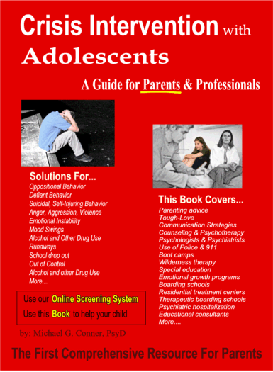 frustrated. If you are looking for help, or just plain confused, I have written a book that may help. �Crisis Intervention with Adolescents: A Guide for Parents and Professionals.� is the first and only comprehensive book that covers what parents need to know. The book is endorsed by qualified professionals and it is based on nearly 20 years of research. Parents reading this book will learn about parenting youth �at-risk�, crisis intervention, educational consulting, counseling and therapy approaches, medications, tough love, wilderness programs, boot camps, residential treatment, hospitals, law enforcement options and much more. The advantages, disadvantages and limitations of over 20 intervention approaches are discussed. I have some simple advice for parents who are looking for help. Don�t send your child to a program unless you are confident in your decision, you understand your options and the program is recommended by a qualified consultant. A qualified professional will have credible and documented training in residential treatment, outpatient mental health, substance abuse, behavioral science, learning and developmental psychology. A highly qualified consultant would also be licensed as a counselor, social worker or psychologist. A licensed health care provider may be able to use your health insurance to pay for their services. Working with a licensed professional can also help protect you from unethical and unprofessional behavior. This includes negligence, incompetence and misrepresentation. If you have the time, you can learn a great deal on your own. To find out more about parenting youth �at-risk�, interventions, services, programs and educational consulting, you can also visit www.EducationOptions.Org. This is a non-profit consumer protection information resource. This entire program is brought to you by Mentor Research Institute and the Central Oregon Family News as charitable community service. StepOne for Parents is supported by a technology grant from the Jeld-Wen Foundation. No financial support has been accepted from pharmaceutical companies. StepOne for Parents was created by a group of concerned parents, mental health care professionals and computer programmers. Mentor Research Institute maintains responsibility for the StepOne for Parents screening program. Michael Conner is a licensed psychologist and an educational consultant. He is a Director for Mentor Research Institute, a 501(c)3 charitable non-profit consumer protection information and education resource (www.MentorResearch.org). He maintains a private practice in Bend Oregon. For more information go to www.CrisisCounseling.com. Dated: November 27, 2013 copyright 2006, InCrisis (all rights reserved) |